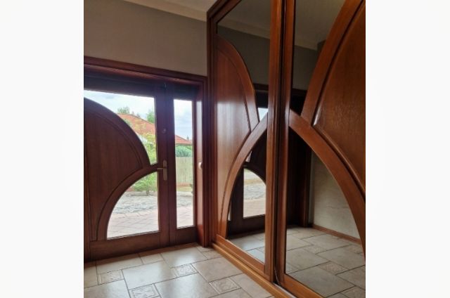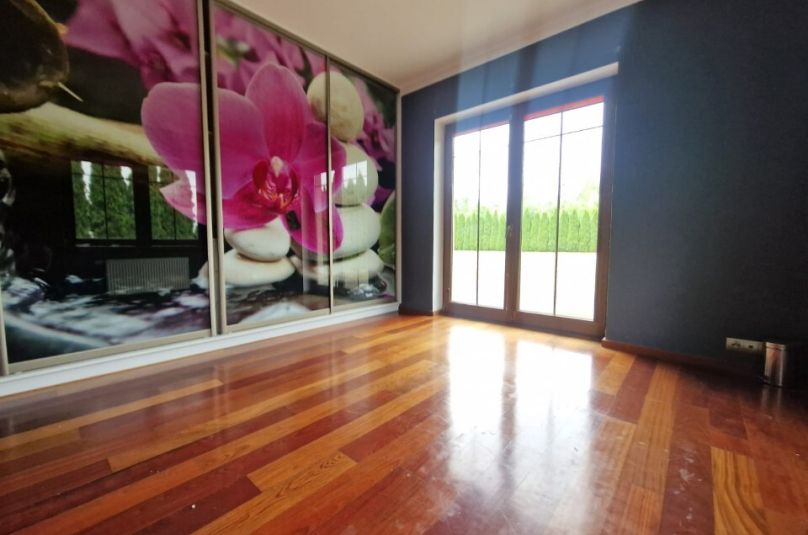 - sypialnia z wyjściem na taras (pojemna szafa w zabudowie z przesuwnymi drzwiami z motywem kwiatowym z wnęką na telewizor)