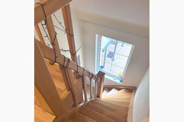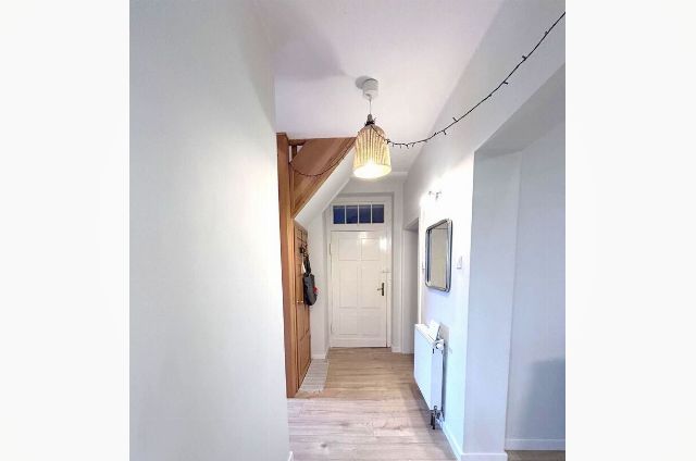 Schody: solidne, drewniane. Ściany: szpachlowane i malowane,