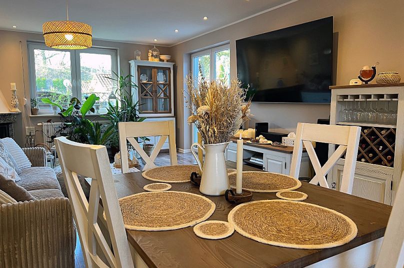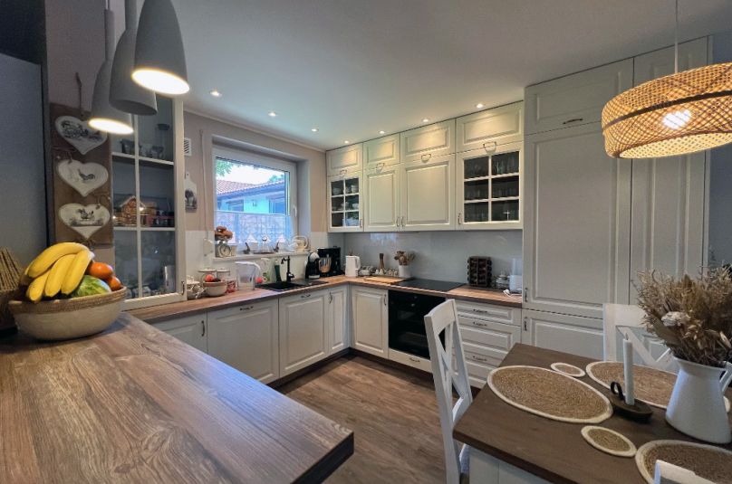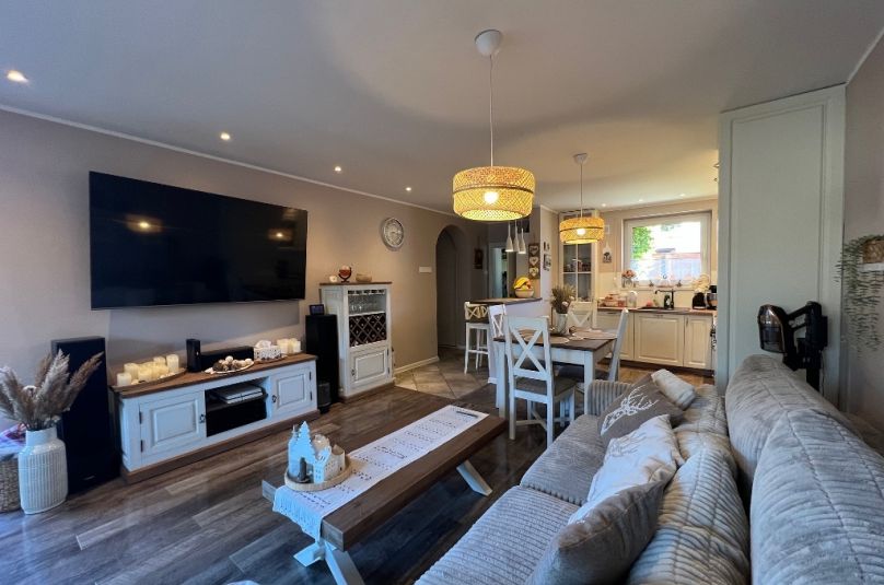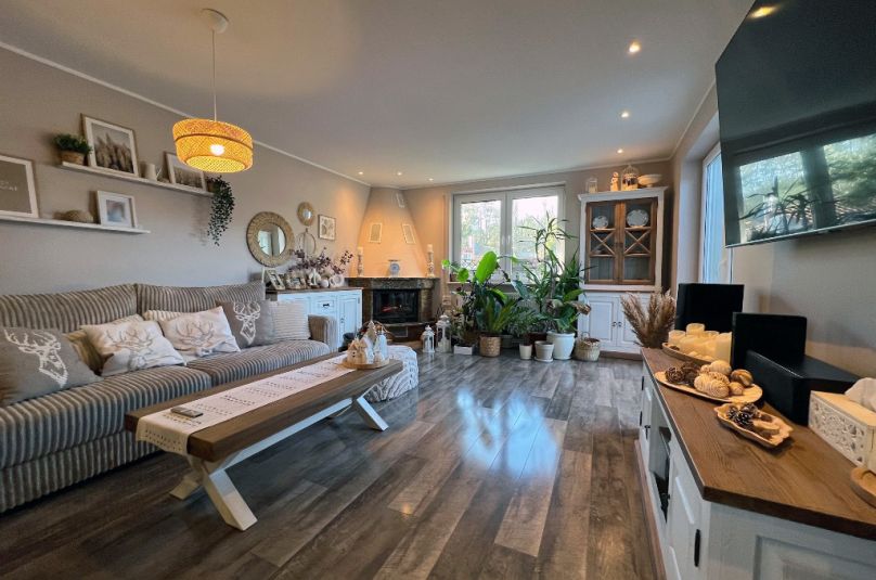 Dom został gustownie urządzony z zachowaniem dbałości o szczegóły, jest bardzo zadbany, bez widocznych śladów użytkowania. Harmonijne zestawienie kolorów, materiałów i dekoracji tworzy spójny projekt, dom o wysokim standardzie wykończenia.