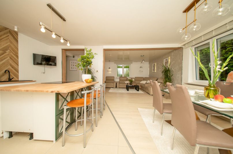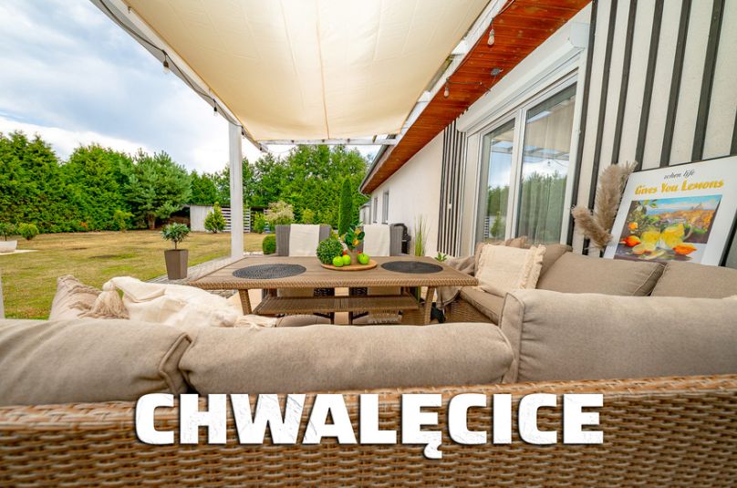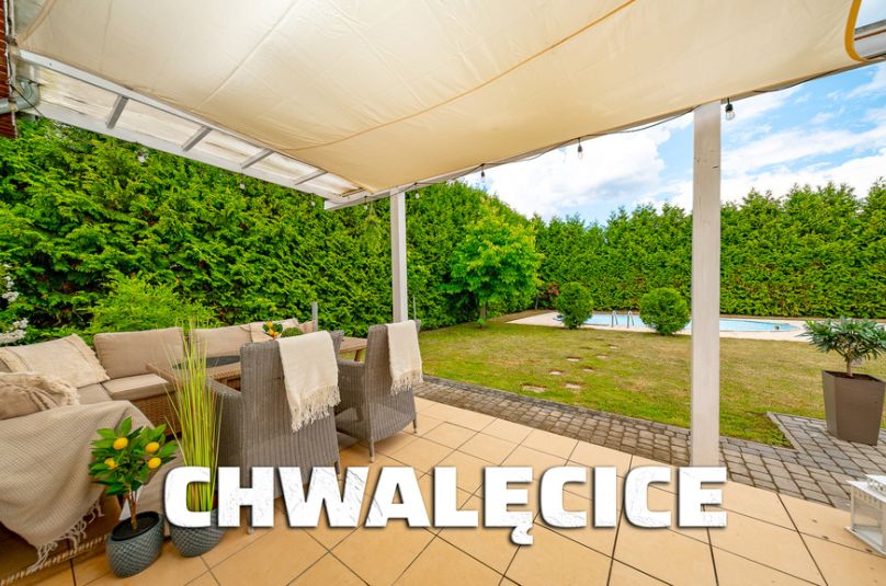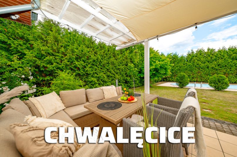 Na zewnątrz znajduje się zadbany ogród z basenem, który latem zapewnia miejsce do wypoczynku. Zadaszony taras z widokiem na zieleń tworzy przyjemną strefę relaksu. W cenie pozostaje większość umeblowania, które świetnie komponuje się ze stylistyką domu.