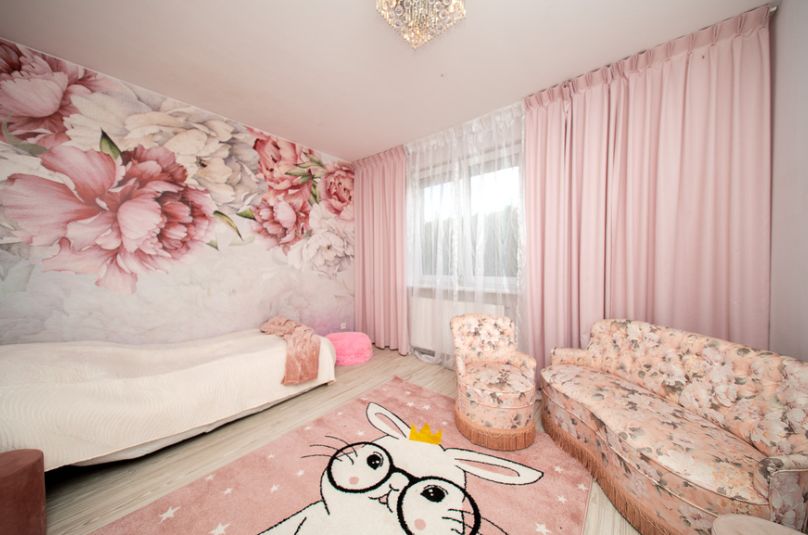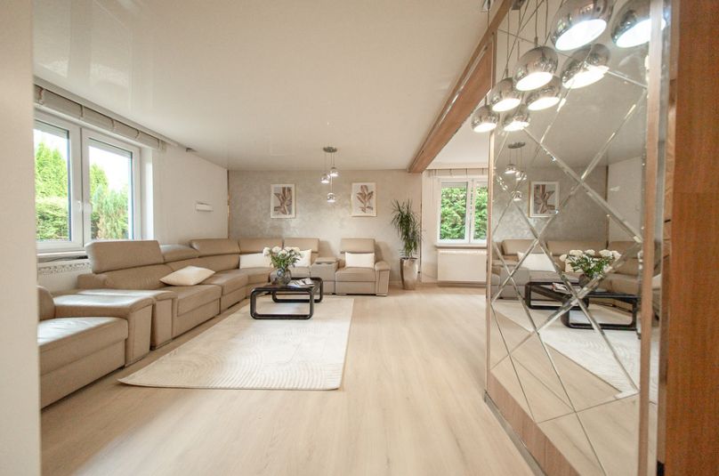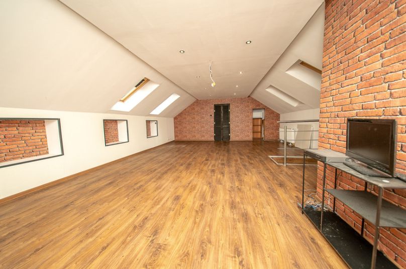 Poddasze to otwarta przestrzeń o powierzchni 45 m² – idealna jako sala kinowa, domowe biuro lub strefa relaksu. Wnętrza są urządzone w stonowanej kolorystyce z wykorzystaniem trwałych materiałów, co nadaje im ponadczasowy charakter.