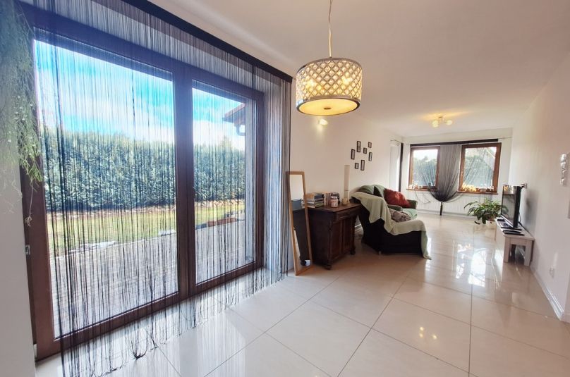 -przestronny, jasny salon z wyjściem do ogrodu i na kameralny taras