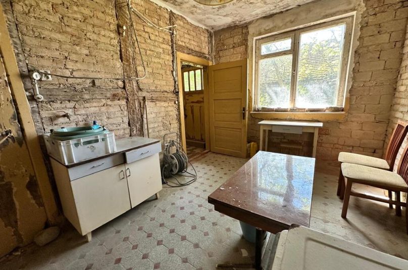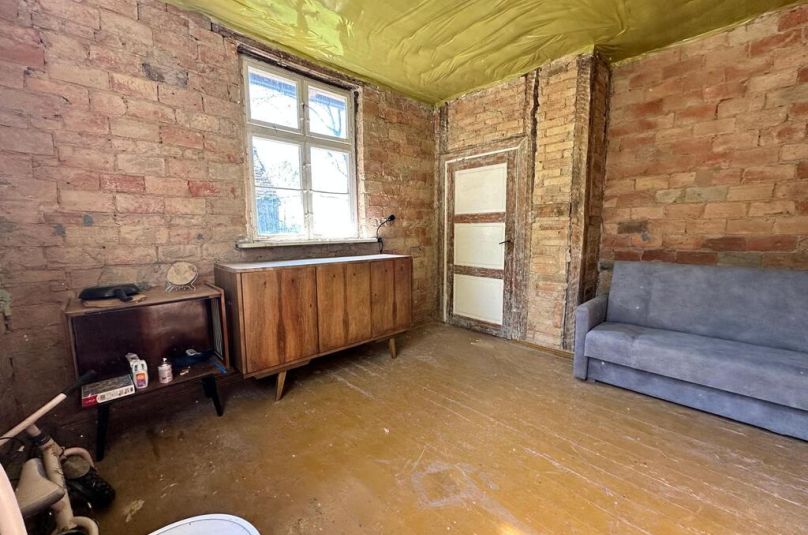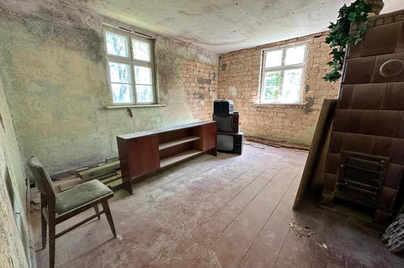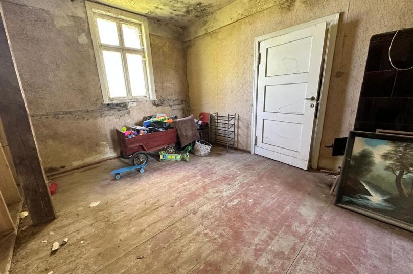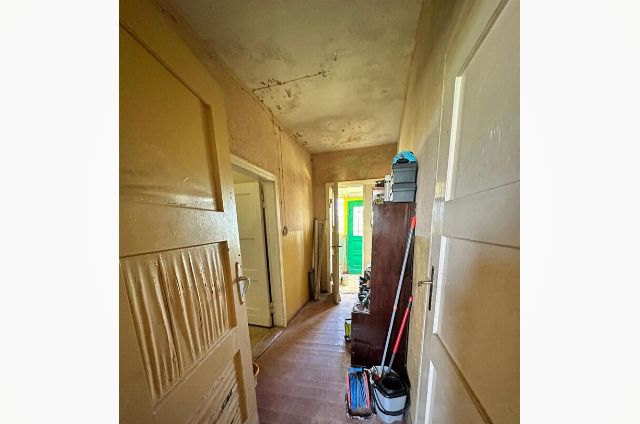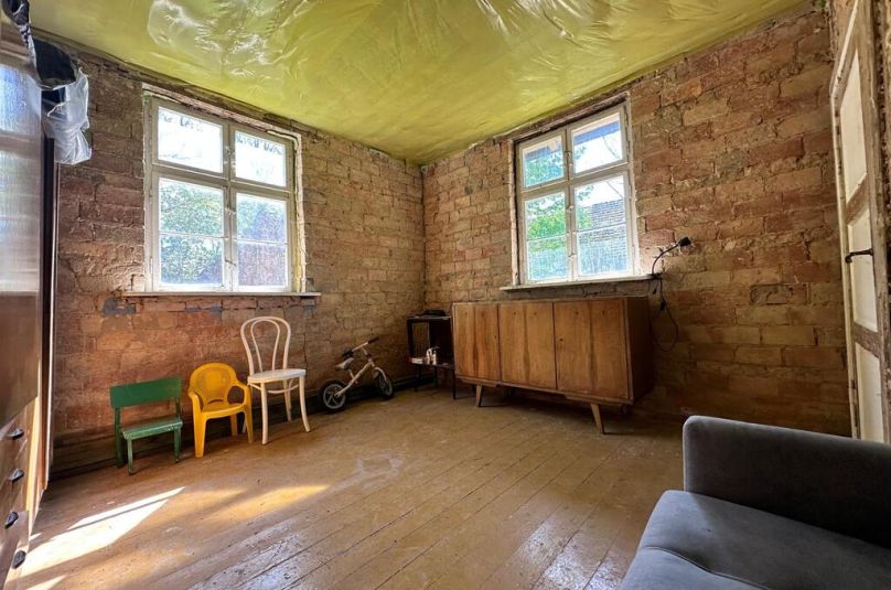 Przedwojenny parterowy dom z możliwością zagospodarowania poddasza (wys. ok.5,20 w najwyższym punkcie, 2,70 m do poprzecznej belki), posadowiony na działce o pow. 2700 m2.