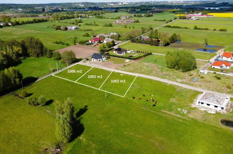 Działka w kształcie prostokąta usytuowana na płaskim terenie, co pasuję idealne pod zabudowę domu jednorodzinnego.