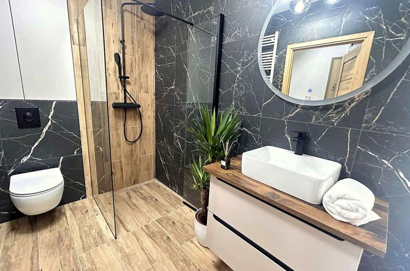 W kuchni wysokiej klasy sprzęt agd na gwarancji (płyta indukcyjna, piekarnik, okap), w łazience nad stelażem podtynkowym głęboka na 50 cm szafka.