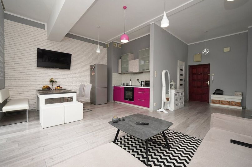 Salon z aneksem kuchennym – idealna przestrzeń do wspólnego gotowania i relaksu, z bezpośrednim wyjściem na balkon, gdzie można wypić poranną kawę.