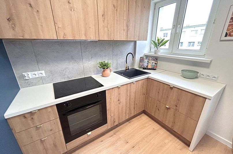 - zabudowa kuchenna wykonana na wymiar przez stolarza, sprzęt AGD: nowa płyta indukcyjna, piekarnik, okap, zlewozmywak,