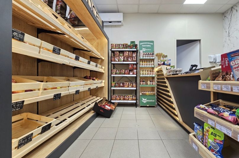 Pawilon jest dostosowany do prowadzenia sklepu, odnowiony i wyposażony w nowe zabudowy drewniane na warzywa, owoce i pieczywo.